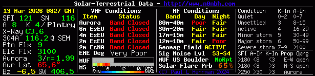 | K | Planetary K Index | NOAA reported value from 0 to 9. Measures disturbances in the horizontal component of earth's magnetic field. Value in nT is measured using a magnetometer during a three-hour interval, and then converted to a factor. Use with A-Index – sees above to determine HF conditions. Updated eight times daily. |
