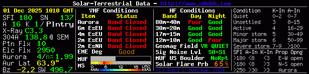 | A | Planetary A Index | NOAA reported value from 0 to 400. Provides a daily average level for geomagnetic activity. Uses the average of eight 3 hour K-Index values (magnetic value measured in nanotesla or nT) to provide the level of instability in the earth’s geomagnetic field. When used with K-Index: Both high indicates geomagnetic field is unstable, and HF signals are prone to sudden fades, and some paths may close while others open up abruptly and with little warning. High K index/Low A indicates a sudden, abrupt disturbance in the geomagnetic field, which can cause an intense but brief disruption in HF propagation, but can cause an auroral event. Updated once daily. |